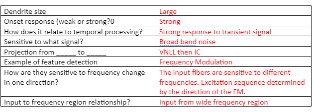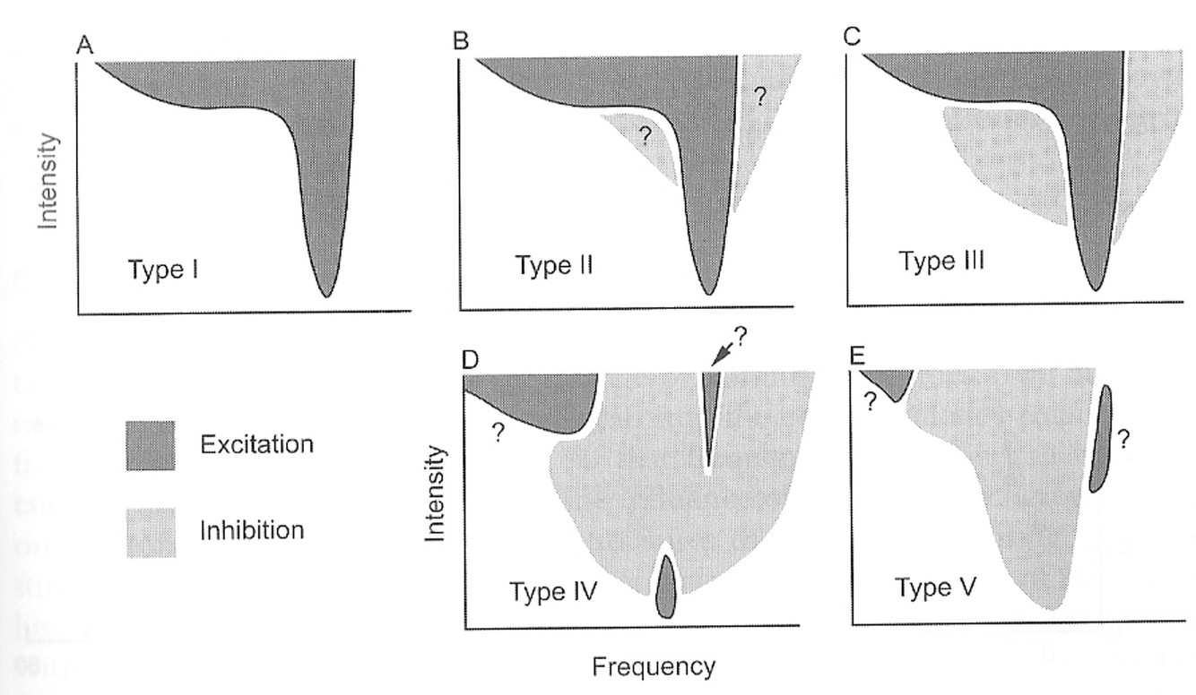For the type II, there are no spontaneous AP’s but the type III do have them. Evidence of inhibition in type III is as a result of reduced spontaneous AP’s at those frequencies for those stimulus intensity levels. However, for type II, because there are no spontaneous AP’s, there are two parts to the evidence: first, a sound at the CF is applied so that the baseline AP’s are obtained (a sort of artificial way to get baseline activity) THEN another sound is applied in the gray areas (ie at those intensity and frequencies) to show that they are inhibited.