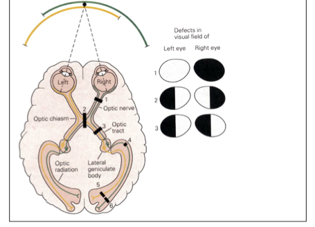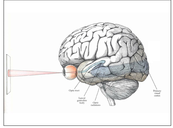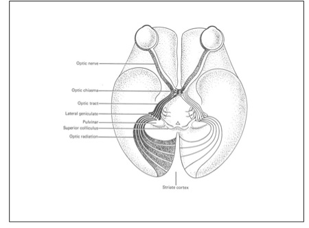 Visual pathway from retina to striate cortex. The right visual field projects to the left hemisphere and the left visual field projects to the right hemsphere.