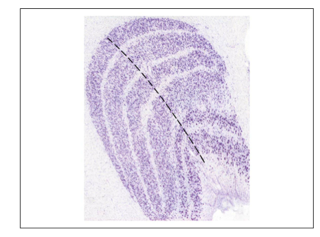 Cross section of the lateral geniculate nucleus (LGN) also known as the geniculate body. The upper four layers are the P zone, and the lower two layers are the M zone.