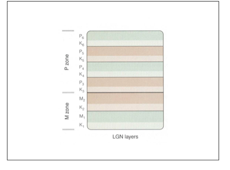 The lateral geniculate nucleus (LGN) is divided into layers. The upper layers (P zone) receive projections from the parvo (midget) ganglion cells in the retina. The lower (M zone) receive projections from the mango (parasol) ganglion cells. The smaller K layers receive input from ganglion cells coding responses from the blue (S) cones. (Green layers receive projections from the contralateral eyee, brown from the ipsilateral eye).