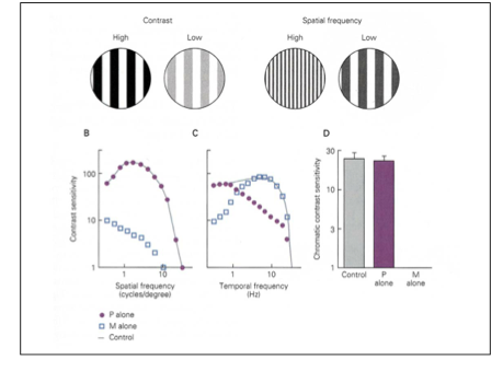 Effects on visual performance of lesions in the P and theM zones of the LGN. P cells: spatial pattern, color. M cells: motion (rapid changes in the retinal image over time.)