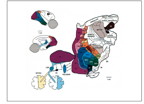 Major connections between visual cortical areas. The width of the connection is proportional to the number of axon fibers. The top side (warm colors) is the so-called “where pathway” and the bottom side (cool colors) is the so called “what pathway”