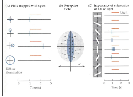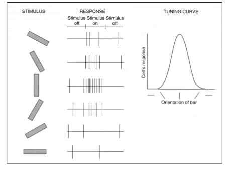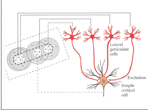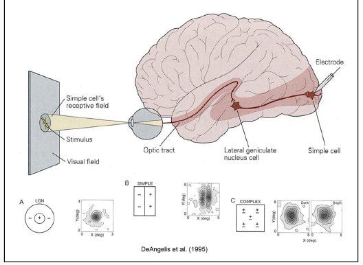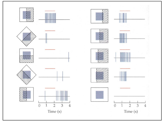 In summary, retinal ganglion cells and LGN cells have center-surround receptive fields. Simple and complex cells in the visual cortex have quite different receptive fields making them selective to orientation, spatial frequency (size), direction of motion and binocular disparity.