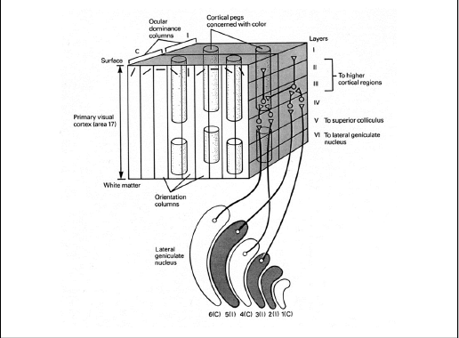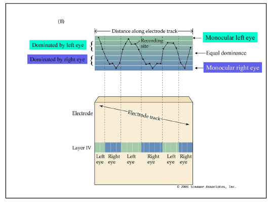 Within the area of binocular overlap, the relative sensitivity of cortical neurons to left and right eye stimulation (the “ocular dominance”) alternates spatially across the primary and visual cortex. This alternating structure of ocular dominance is the so-called “ocular dominance columns” of the primary visual cortex.