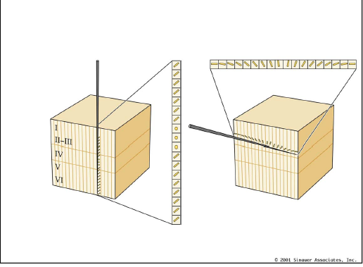 The orientation selectivity of cortical neurons also varies spatially in a systematically fashion across the primary visual cortex. This spatial structure is the so-called “orientation cloumns” of primary visual cortex.