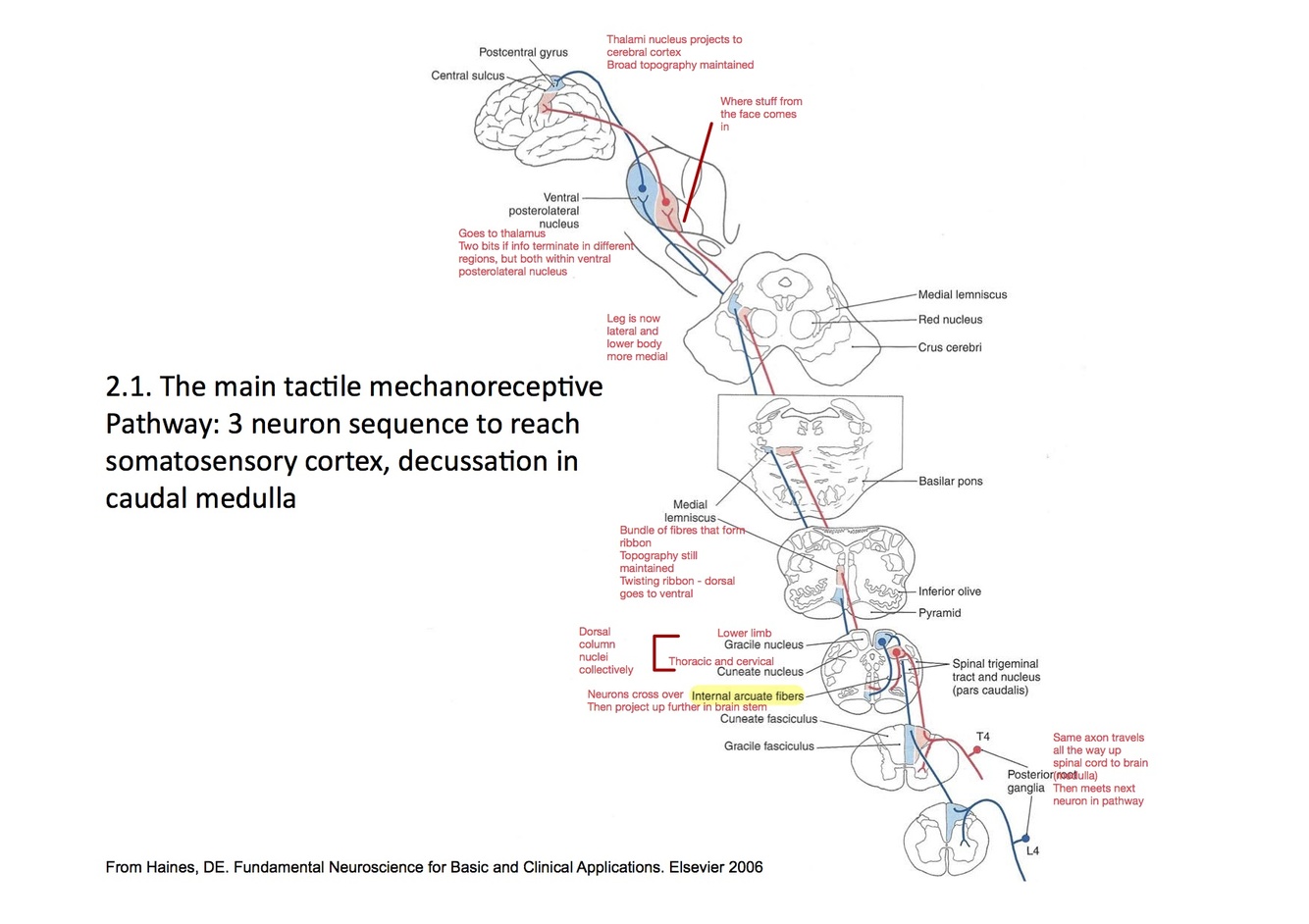 Which part of the tactile mechanoreceptor pathway is ipsilateral?