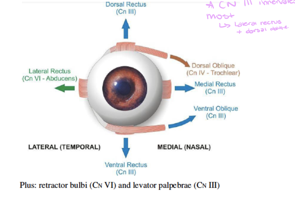 GSE: dorsal rectus, medial rectus, ventral rectus, ventral oblique, levator palpebrae