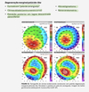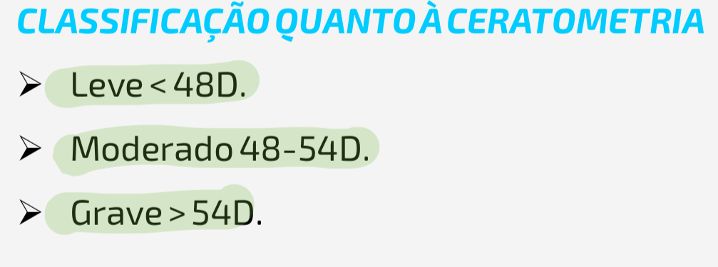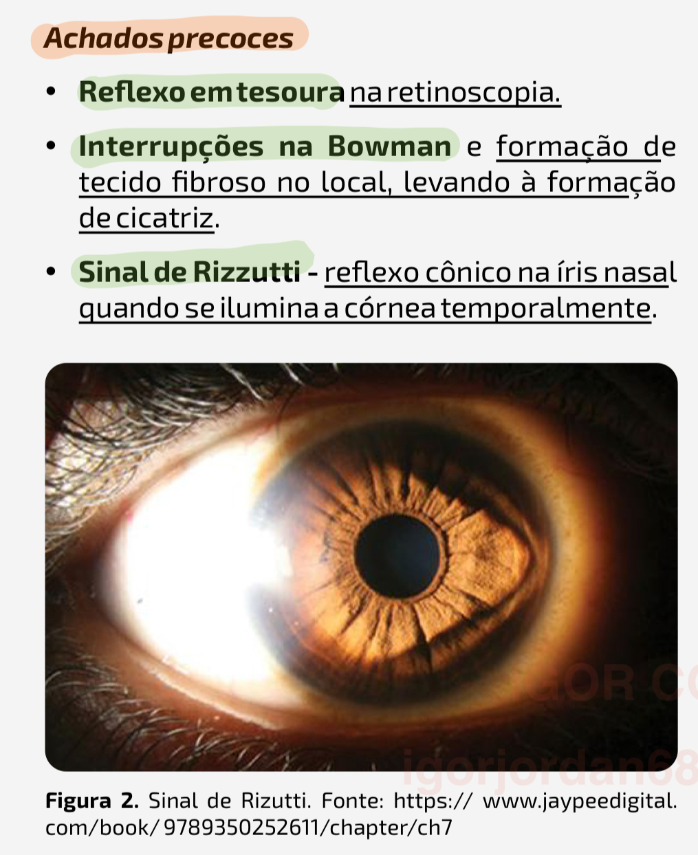 Bilateral, assimétrica, progressiva, com afilamento/abaulamento corneano paracentral, levando a astigmatismo assimétrico (geralmente nos 2/3 centrais com o ápice paracentral inferior).