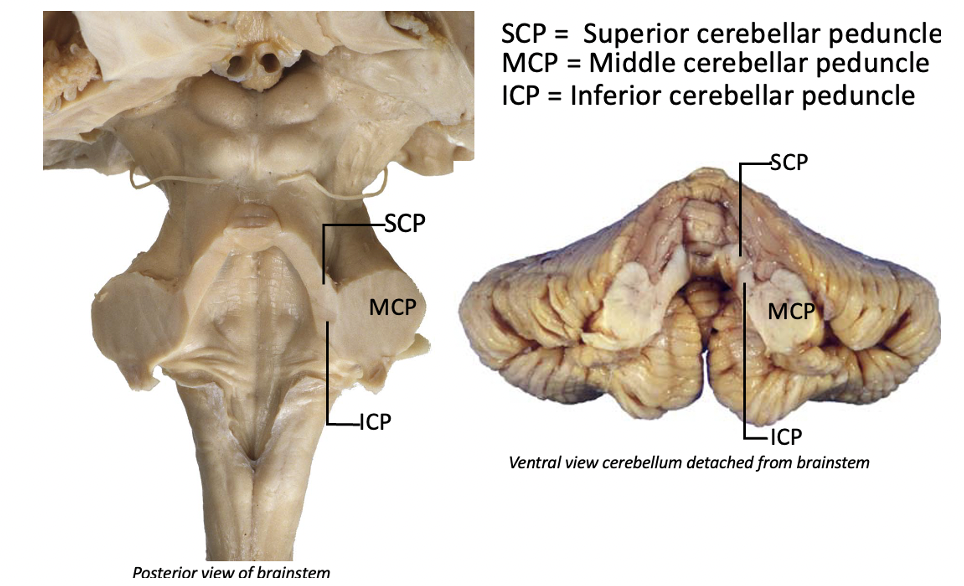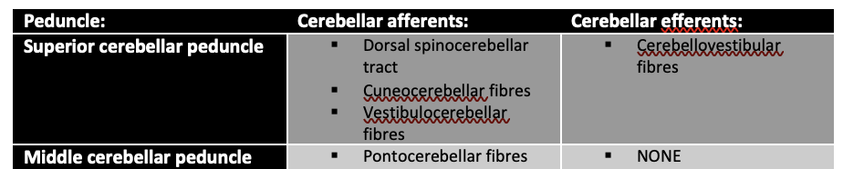 What are the afferent and efferent fibres carried by the middle cerebellar peduncle?