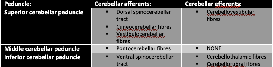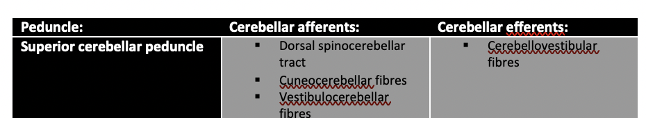 What are the afferent and efferent fibres carried by the superior cerebellar peduncle?
