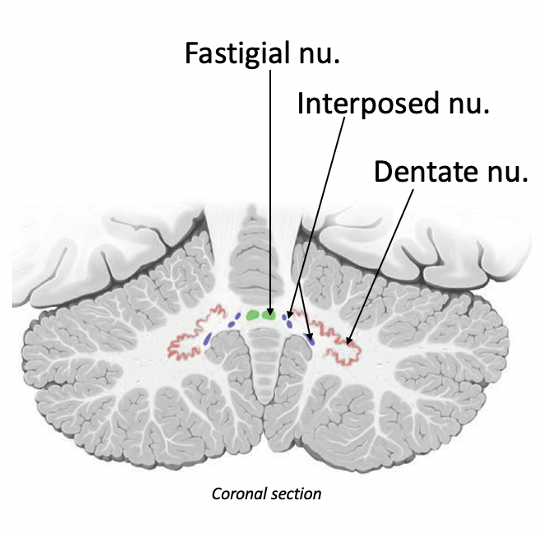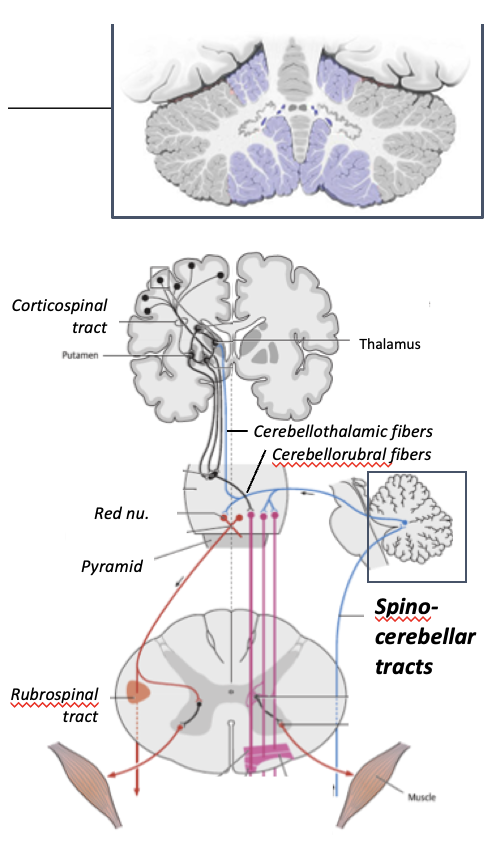 cerebellorubral fibres (via SCP) travel to the red nucleus of the brainstem