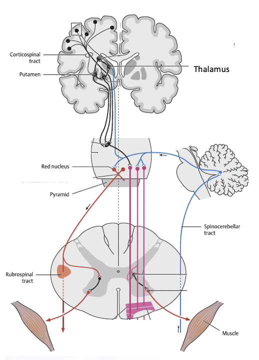 cerebellothalamic fibres (via SCP) travel to the VA / VL nuclei of the thalamus