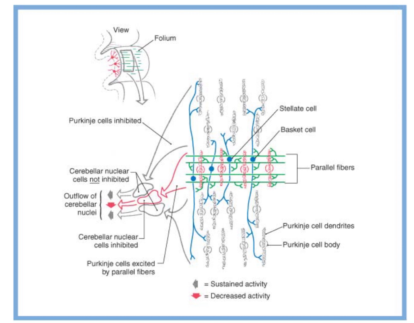 Esquema del resultado de la activación de un haz de fibras paralelas sobre las células de Purkinje de su dominio, sobre la salida corticonuclear y la salida cerebelosa