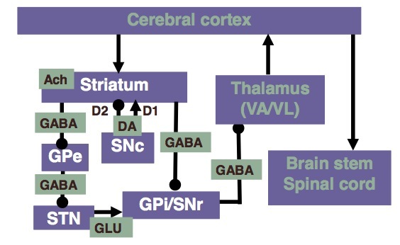 The striatum receives stimuli from the cortex and inhibits the GPi/SNr via GABA in the direct pathway as well as GPe via GABA in the indirect pathway. GPe releases GABA onto the subthalamic nucleus which activates the GPi/SNr using glutamate. The GPi/SNr inhibits VA/VL of the thalamus with GABA. The thalamus projects excitatory inputs back to the cortex. The SNc activates the direct pathway of the striatum (D1 receptor) and inactivates the indirect pathway of the striatum (D2 receptor) using dopamine