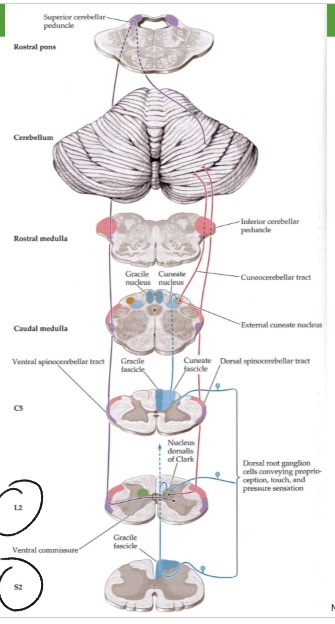 The afferent fiber pathways determine unconscious proprioception about the limb movement. Which of the following determine proprioception, pressure, and touch relating to the lower limbs?