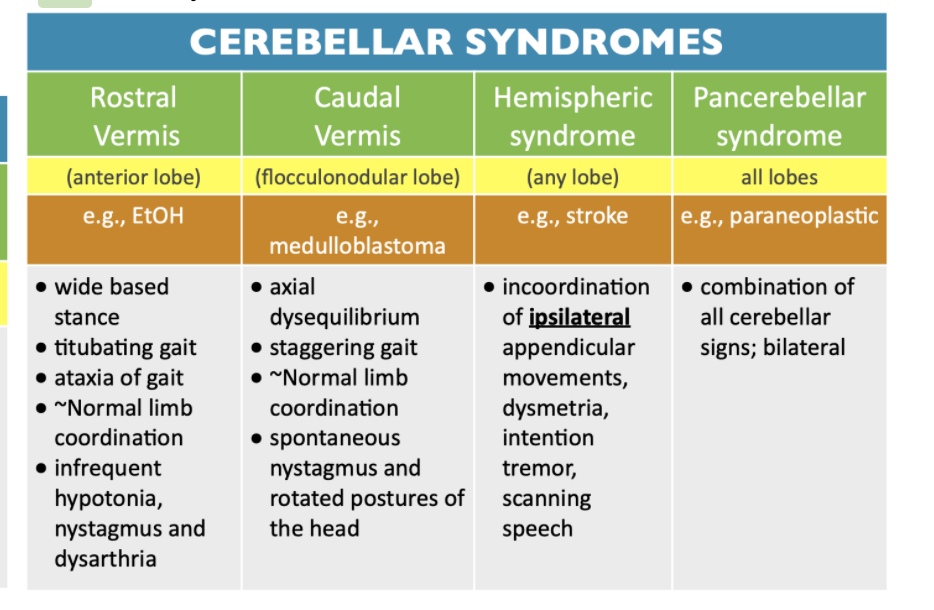 Diffuse lesions will have more clinical manifestations, and can have a number of etiologies (post infectious cerebellitis, particularly in pediatric population), degenerative (sporadic or genetic), toxic, inflammatory (ex/ paraneoplastic– through molecular mimicry, you develop antibodies to the tumor, but you also end up developing an immune response to the purkinje cells/other own body cells.)