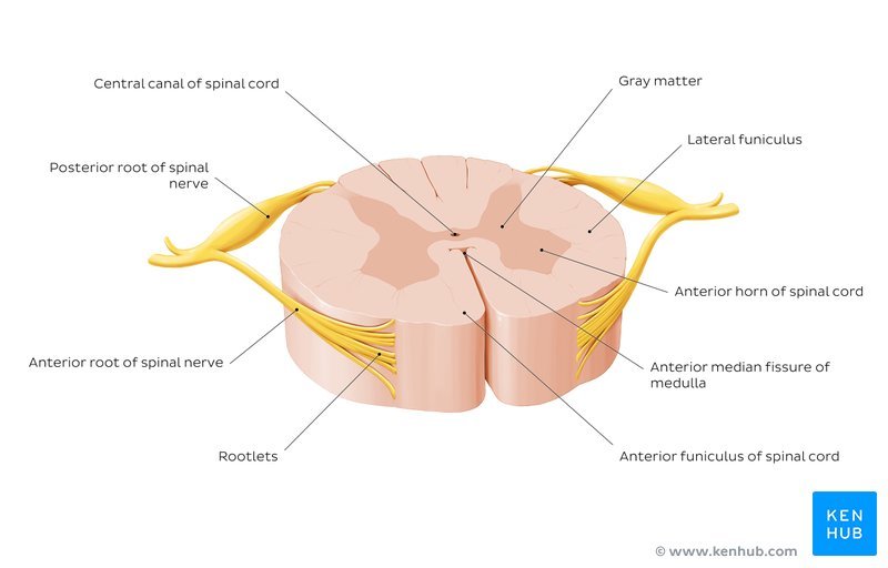 Its gray matter is divided into three cell columns on each side