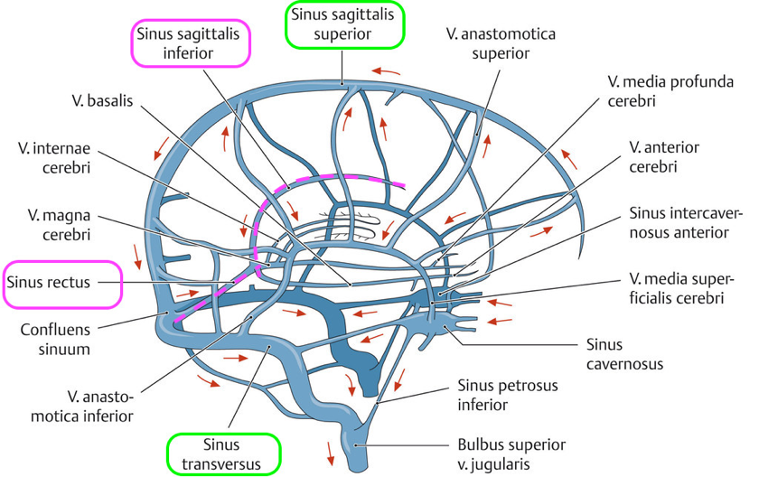 Den rosa Sinus sagittalis inferior i bilden är en djup. Den kommer gå via Sninus rectus till Confluens sinuum (som de andra).