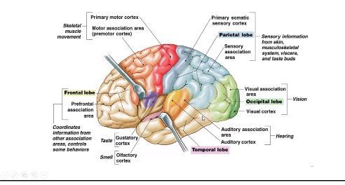 association area creates spatial map of where you area- can lead to disorientation (getting lost), hemispatial neglet (unaware of contralateral side ie damage to right parietal lobe= left side not processed- see diagram)