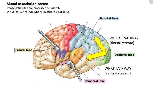 important for interpreting info going to primary visual cortex, dorsal stream goes to parietal lobe for the WHERE pathway (where in space), venteal steam goes towards temporal lobe for WHAT pathway (identification, colour)