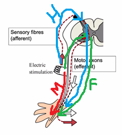 F-wave = is a late response that follows the motor response (M). It is purely motor - motor nerve innervation from electrical stimulus to the cell bodies in the spinal cord, then synapses onto another motor neuron that comes down to cause the twitch