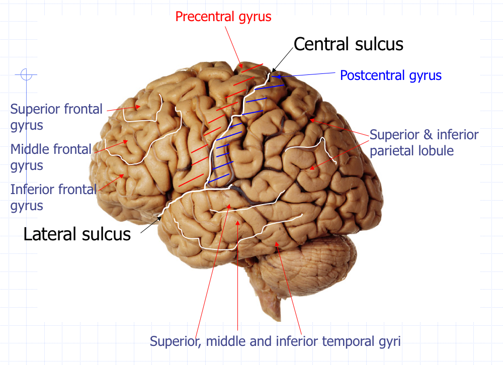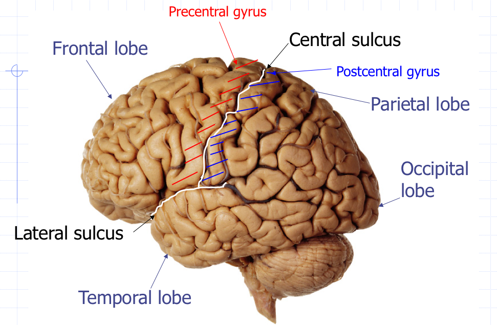 Precentral gyrus - primary motor cortex, somatotopic representation of contralateral half of body (motor homunculus)