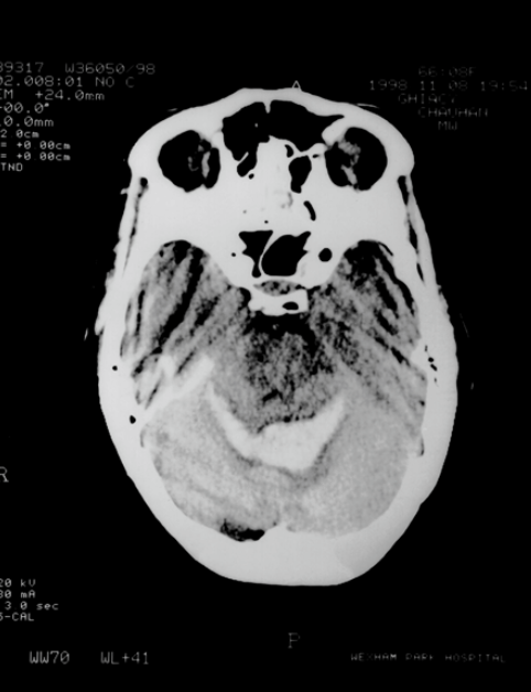 Haemorrhagic stroke - affecting middle cerebral artery (fresh blood shows as white lesions on the CT scan)