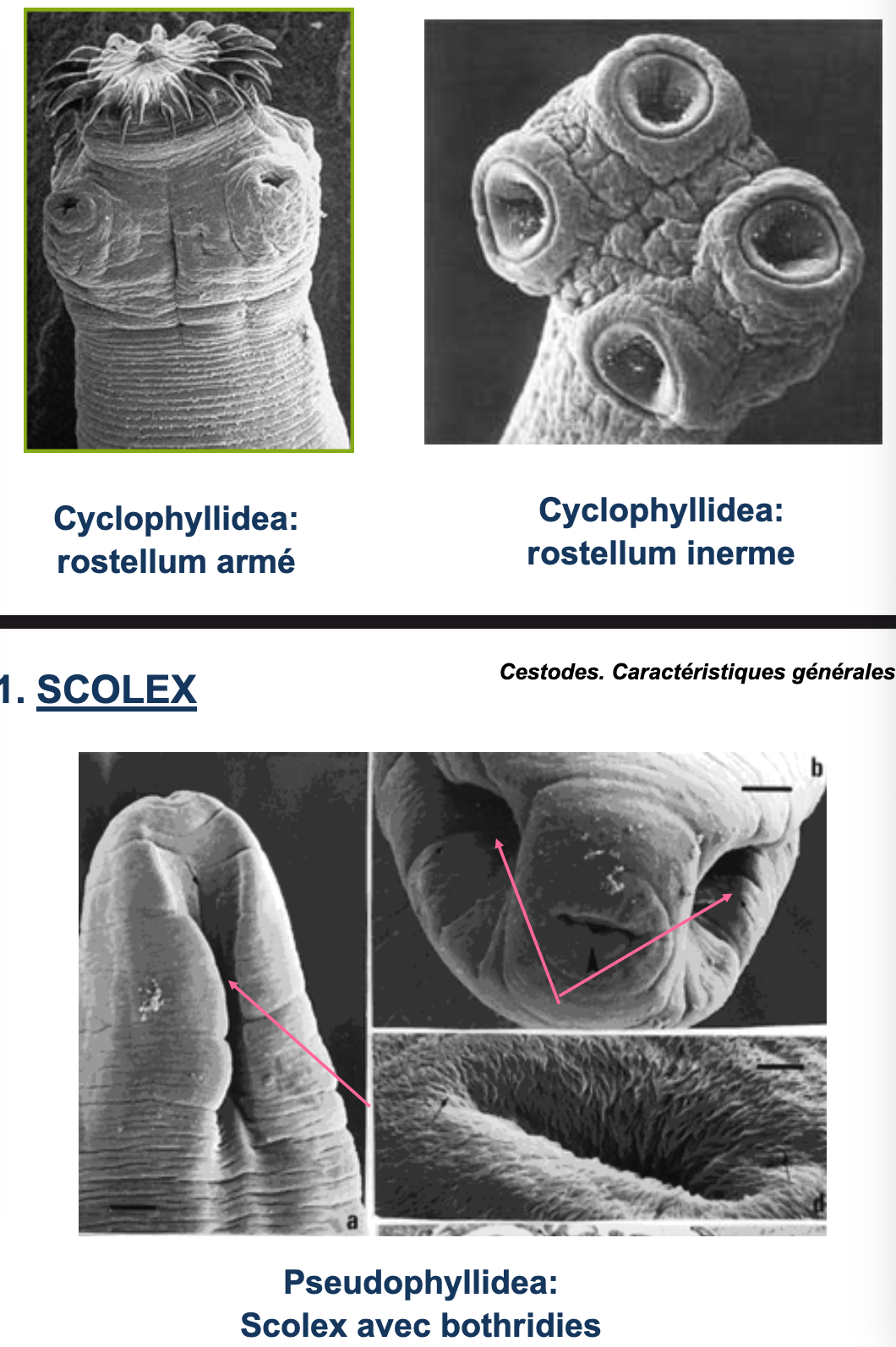 Type Pseudophyllidea: Scolex avec BOTHRIDIES(dépressions linéaires sans musculature).