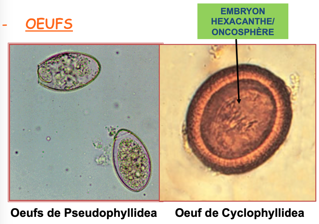 a) Type PSEUDOPHYLLIDEA: Operculés et avec un esquisse d’embryon au moment de la ponte, similaires à ceux des trématodes Digenea.