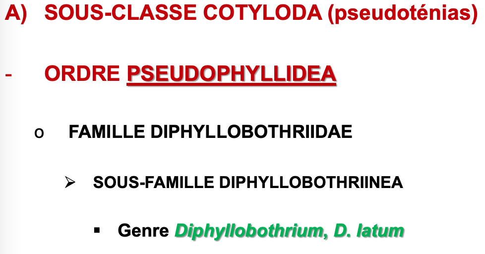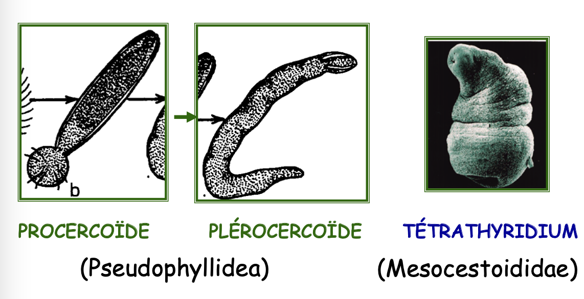 2. PLÉROCERCOÏDES. Cylindriques, non segmentés, avec scolex antérieur (bothridies). Infectante pour l’HD. Chez Pseudophyllidea.