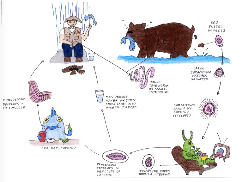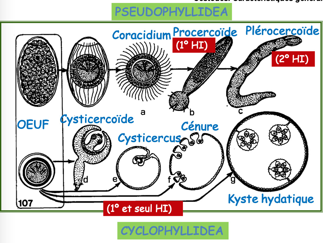 Libération du coracidium dans l’eau => procercoïde dans crustacés copépodes (1er HI) => plérocercoïde dans poissons d’eau douces (2ème HI). L’HD s’infecte en mangeant du poisson cru.