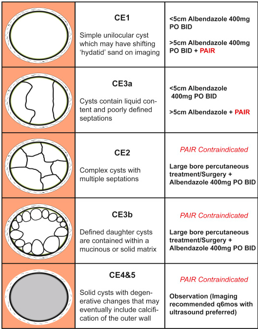 CE1 - simple cyst. <5cm albendazole, 5-10cm PAIR and ABZ, >10cm surgery