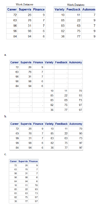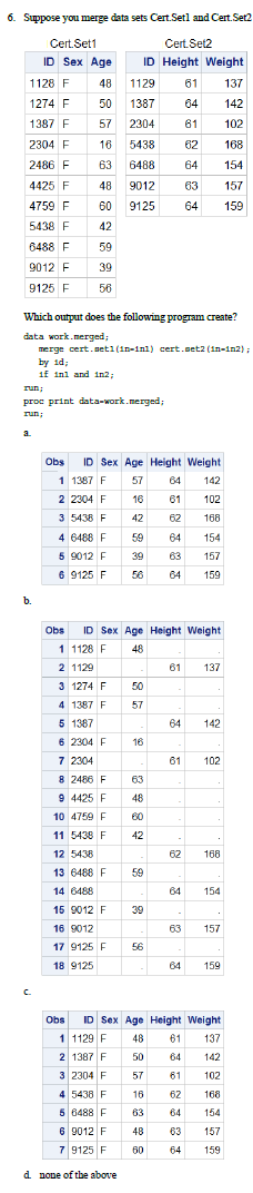The DATA step uses the IN= data set option, and the subsetting IF statement excludes unmatched observations from the output data set. So, answers a and b, which contain unmatched observations, are incorrect.