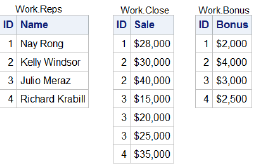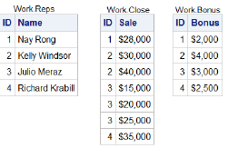 If you merge data sets Work.Reps, Work.Close, and Work.Bonus by ID, what is the value of Bonus in the third observation in the new data set?