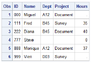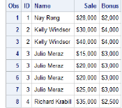 In the new data set, the third observation is the second observation for ID number 2 (Kelly Windsor). The value for Bonus is retained from the previous observation because the BY variable value did not change. The new data set is shown below.