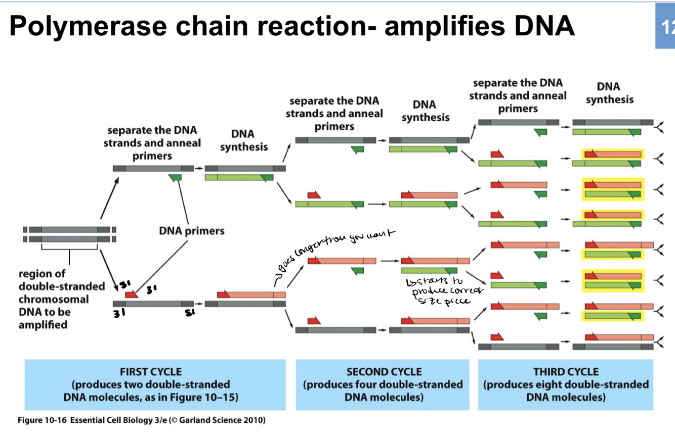 3) cool down, let the primer bind, and let the replication happen. Some of the initial fragments will be too long, but as you copy, the correct sized ones will increase exponentially.