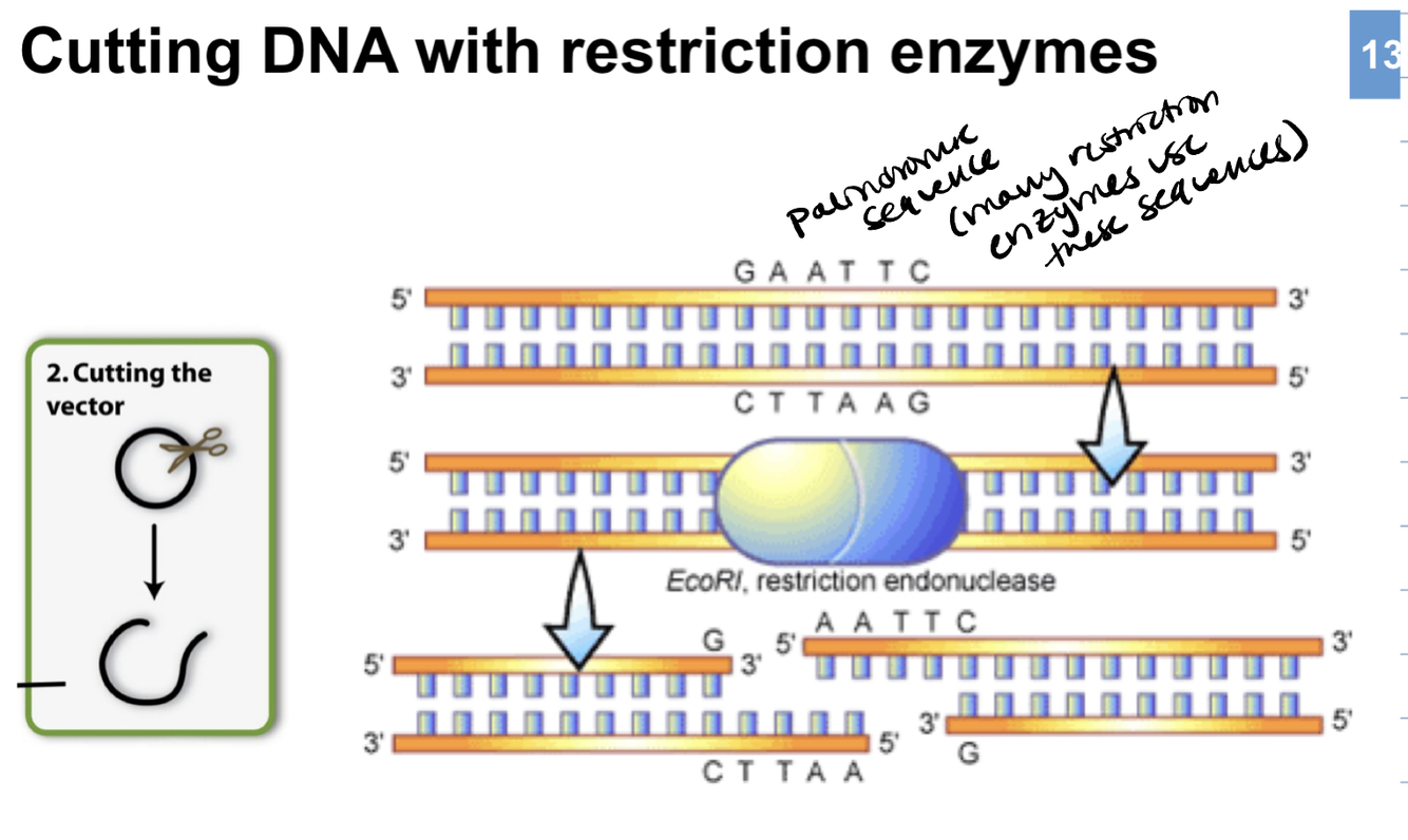 cut the DNA as a specific spot (a palindromic sequence). Leave a sticky overhang to which other things can bind.