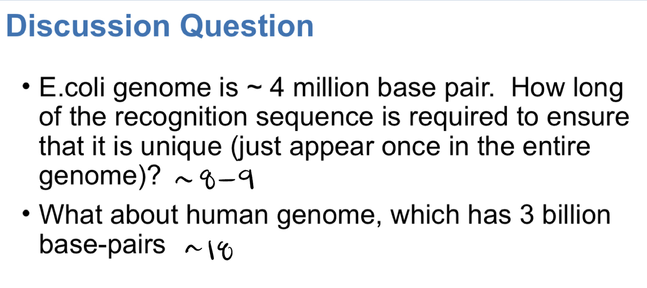 The exact numbers don’t matter, but the longer a genome, the longer a sequence needs to be in order for it to be specific to one spot.
