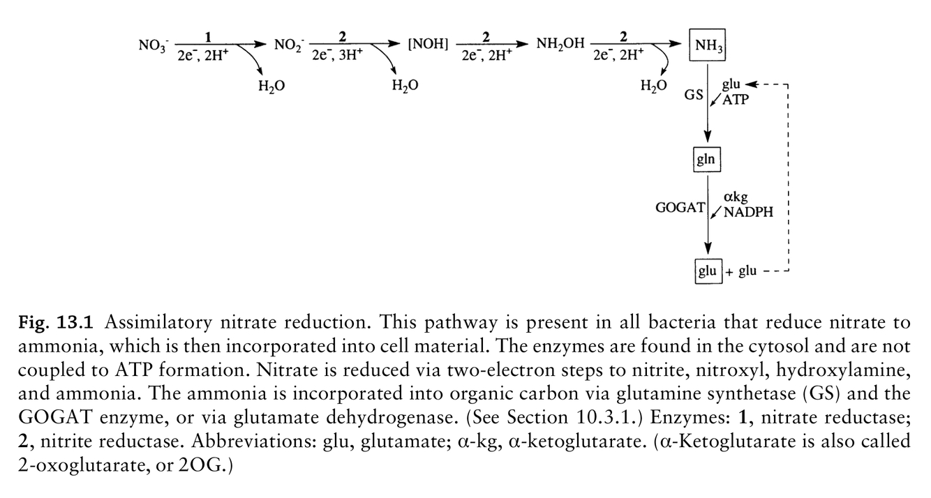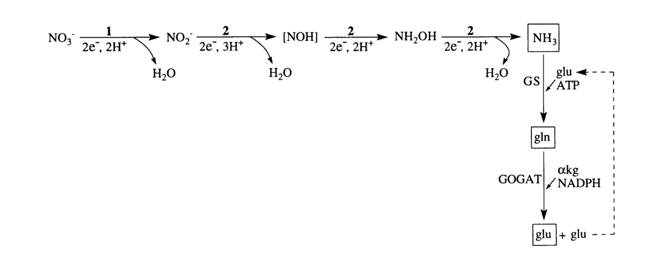 Expalin what is happening in the assimilatory nitrate reduction pathway.