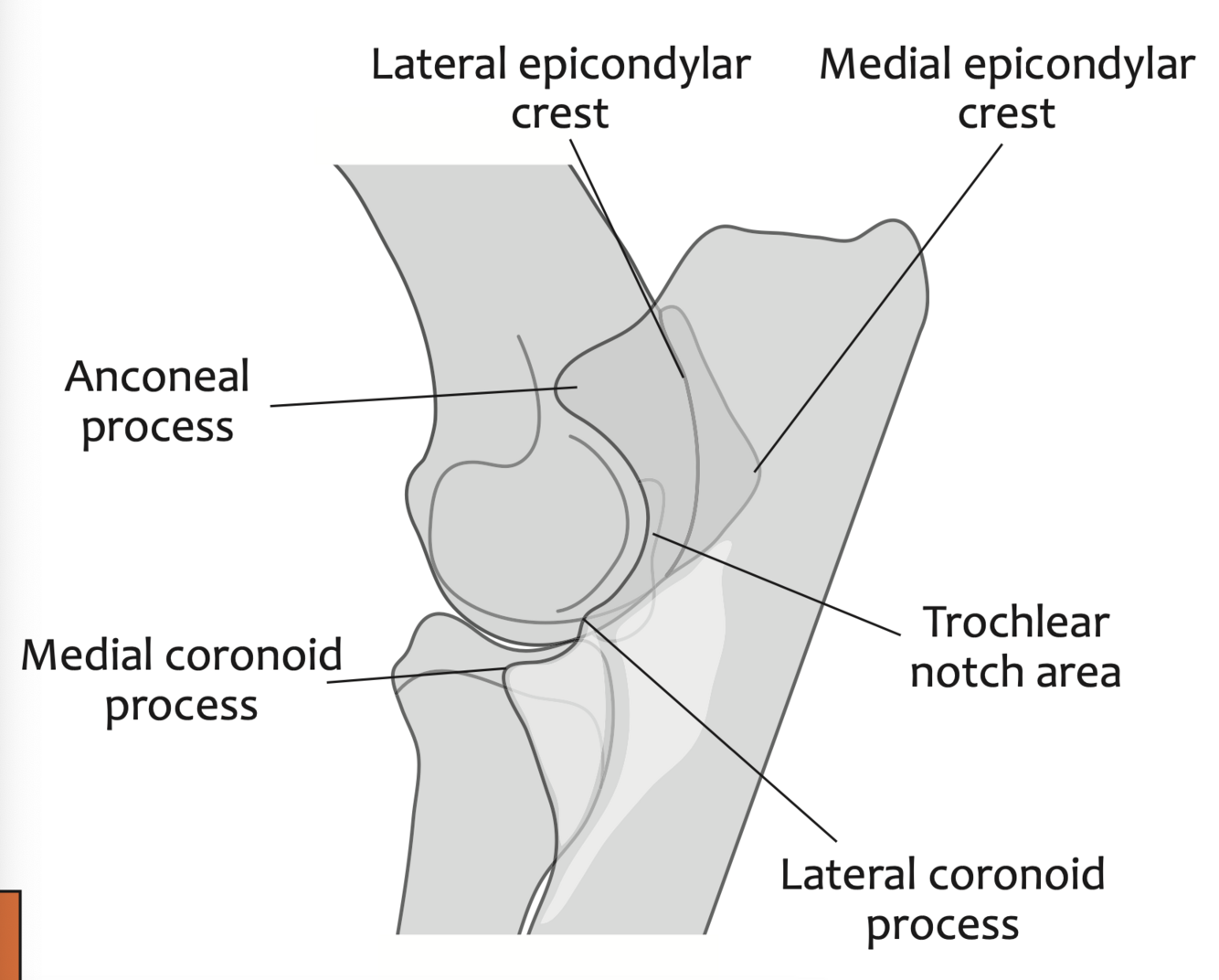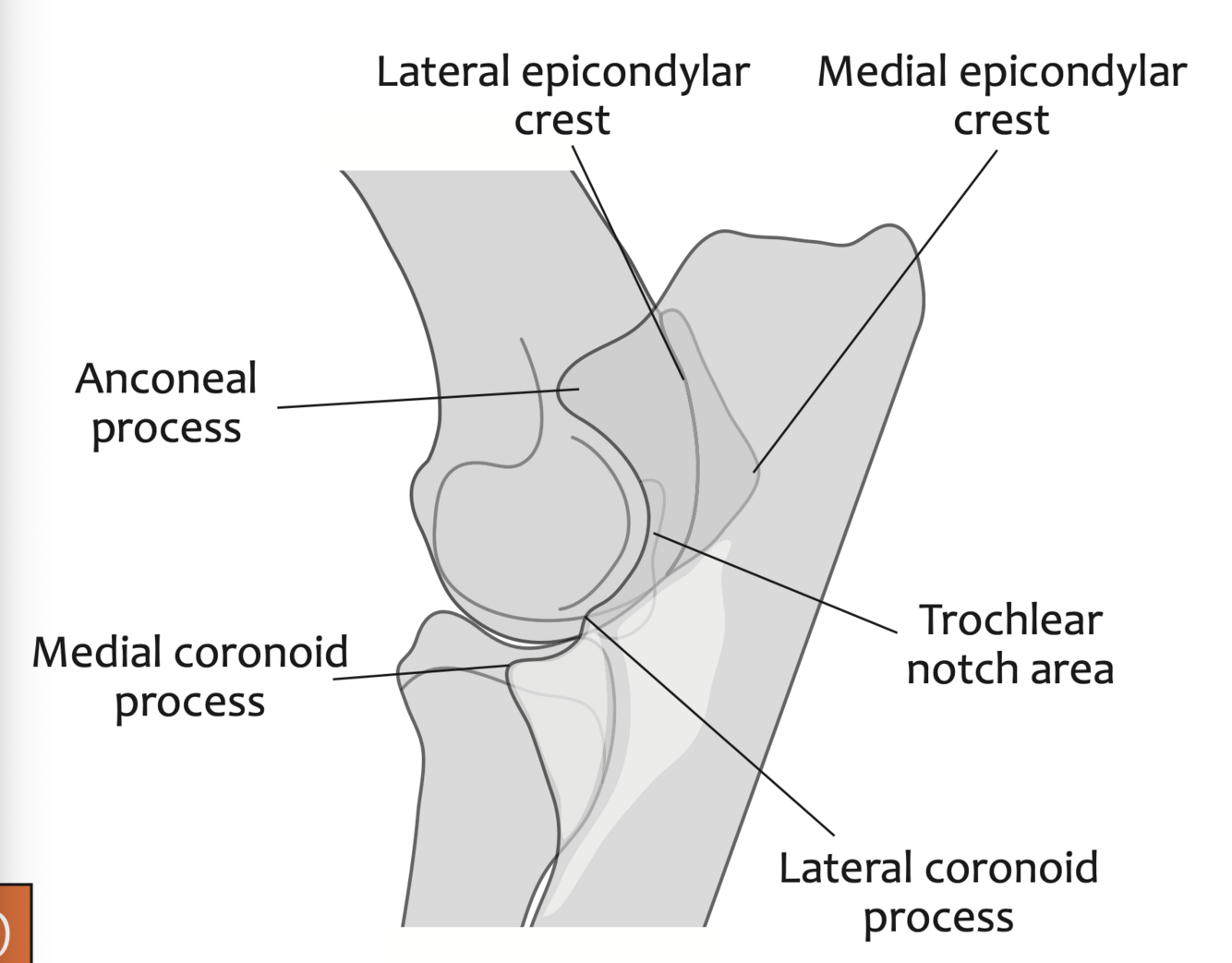 Point out: anconeal process, trochlear notch, medial and lateral coronoid process, medial and lateral epicondylar crest