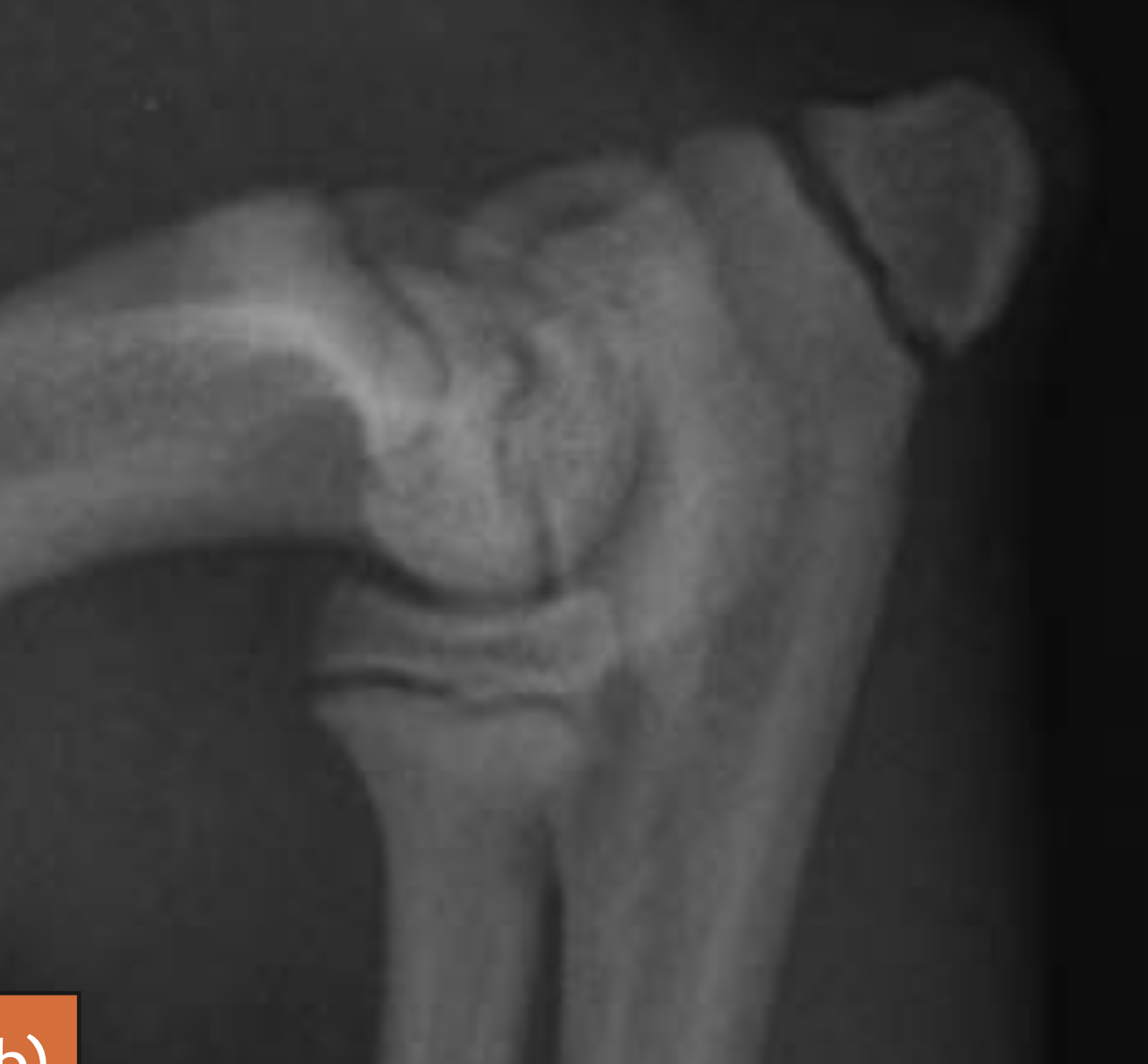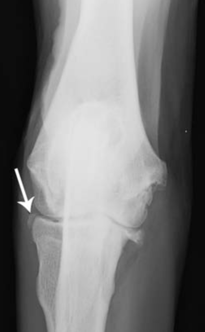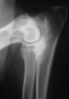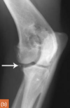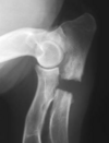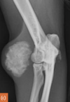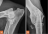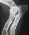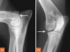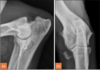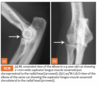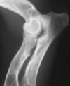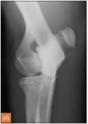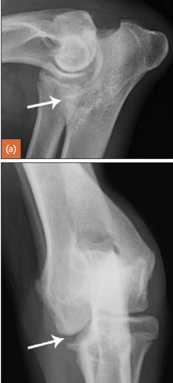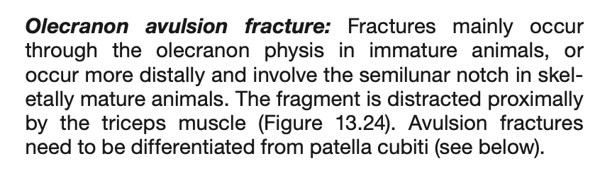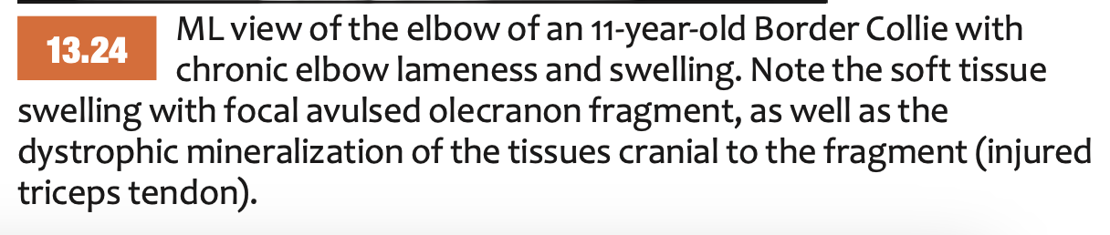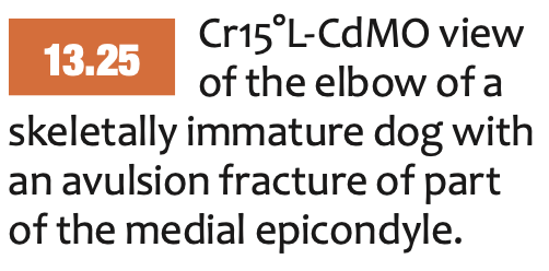 Medial epicondyle avulsion fracture: This is usually associated with a traumatic incident, and results in fragments of various sizes seen medially or mediodistally to the medial epicondyle on CrCd or Cr15°L-CdMO views (Figure 13.25). This condition needs to be differentiated from an ununited medial humeral epicondyle, seen occa- sionally in Labrador Retrievers