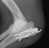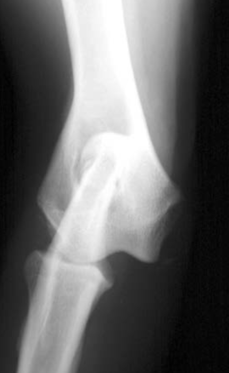 lateral humeral condylar fracture - see its caudal displacement, superimposed over the cranial ulna.