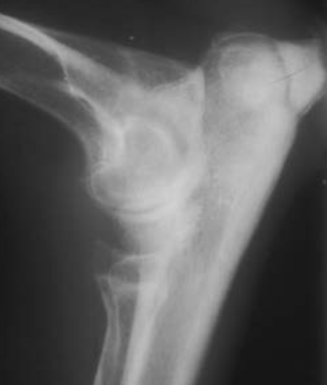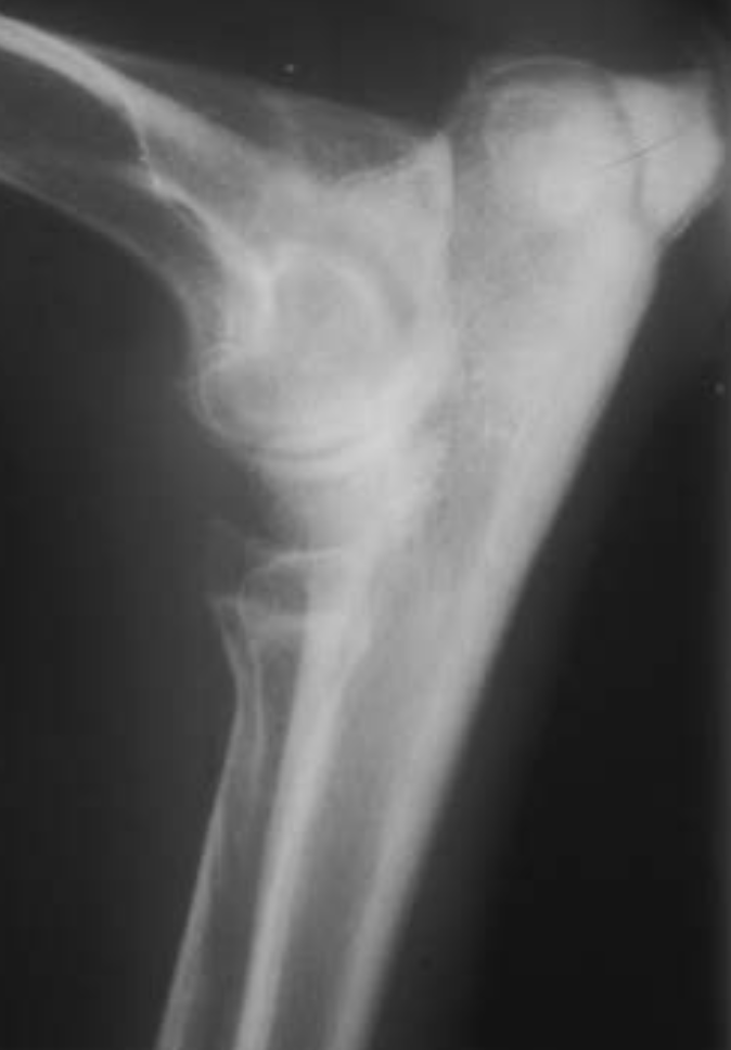 Widened humeroulnar joint > a subluxation due to premature closure of distal ulnar physis