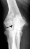 There is a fractured MCP on the medial aspect of the joint.