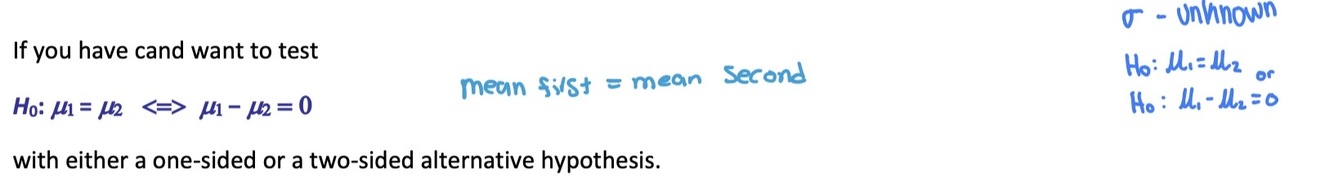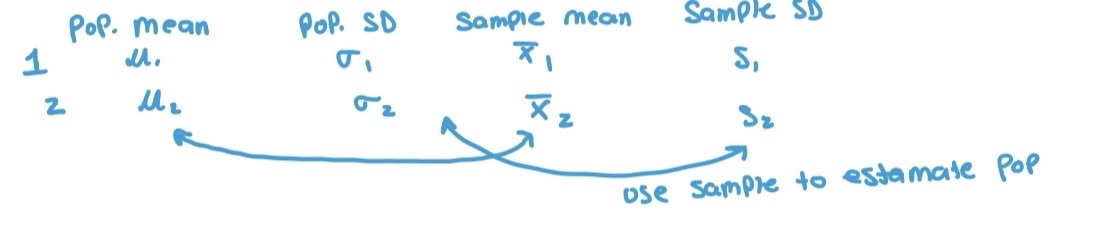 Because we have 2 independent samples we use the difference between both sample averages (x1-x2) to estimate (u1 − u2).