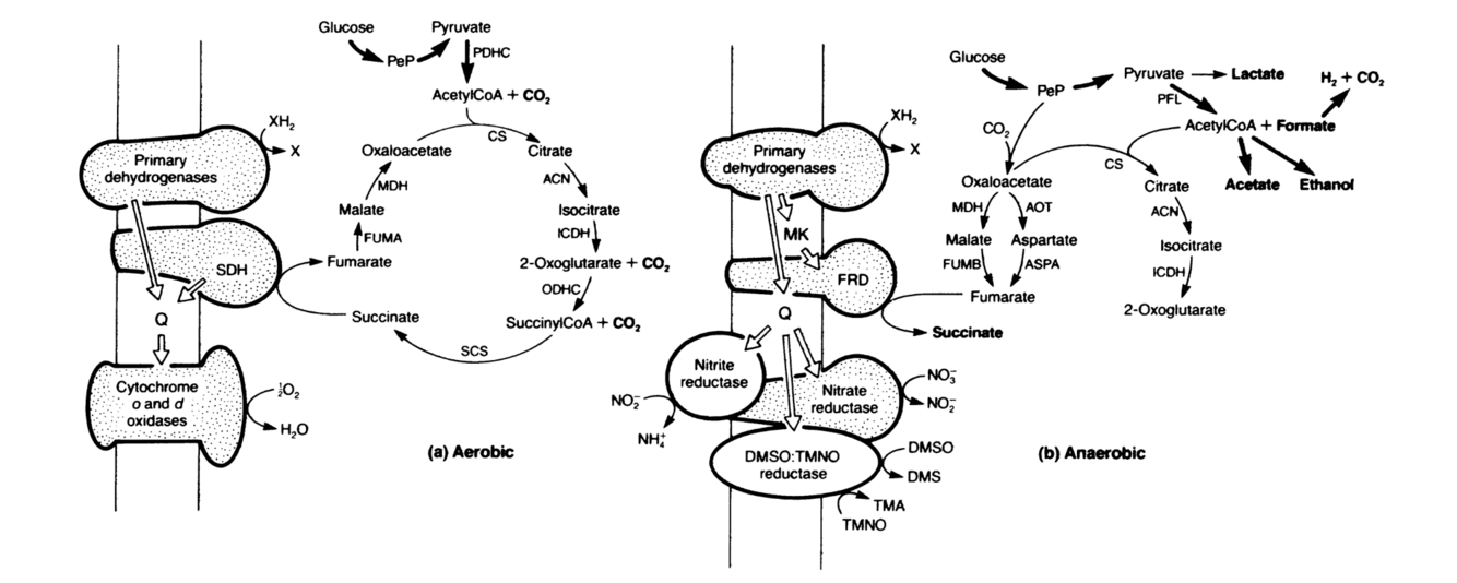 Use the figure to describe the metabolic changes E. coli undergoes during anaerobiosis.