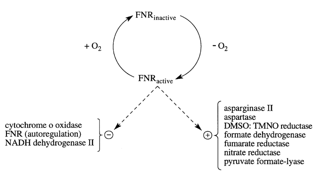 - Active FNR: homodimer of an iron-sulfur protein with an oxygen labile [4Fe-4S] cluster in each monomer