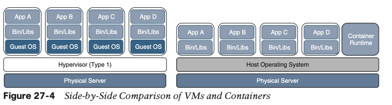 Figure 27-4 shows a side-by-side comparison of VMs and containers. Notice that each VM requires an OS and that containers all share the same OS while remaining isolated from each other.