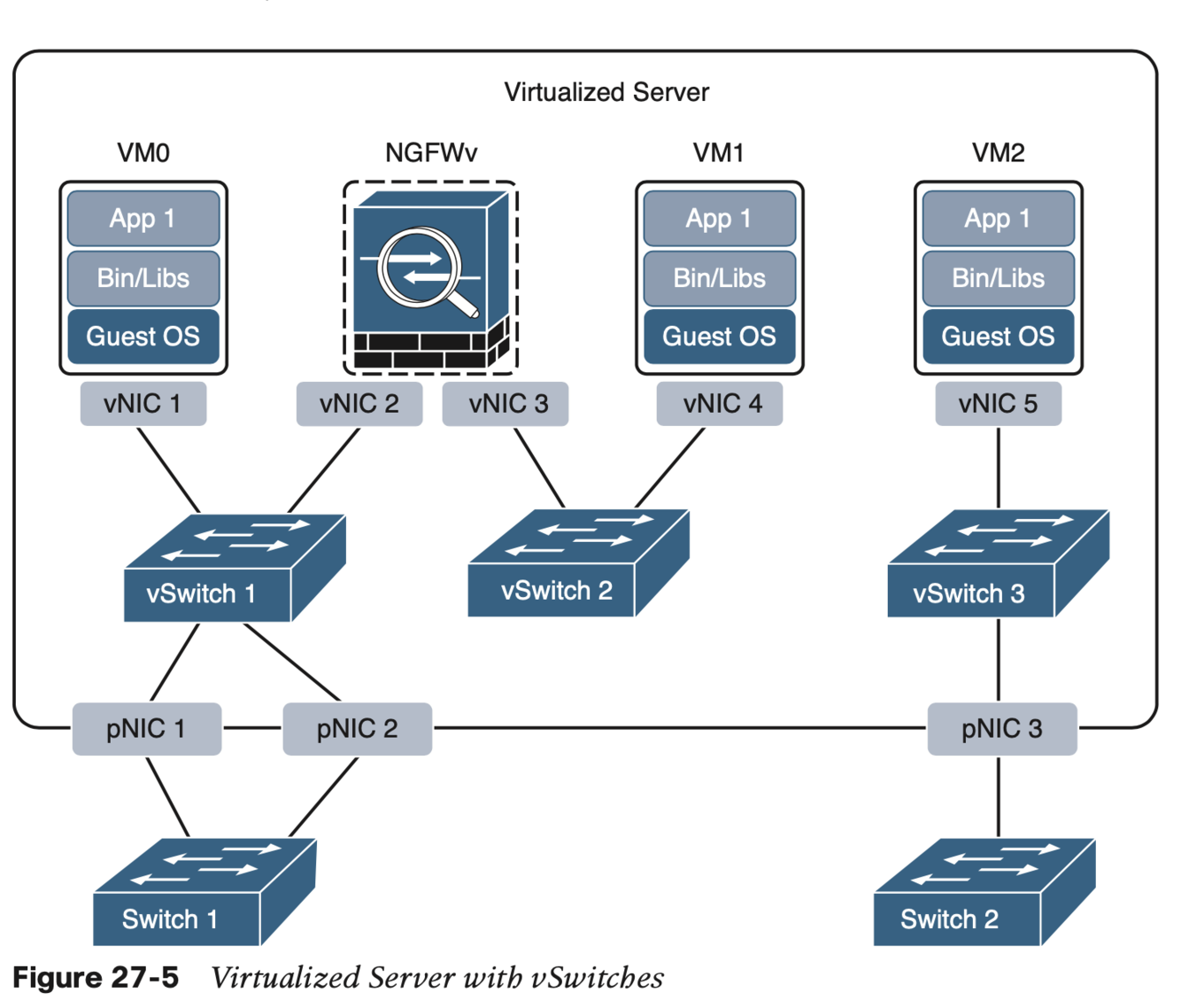 Figure 27-5 illustrates a virtualized server with three vSwitches connected to the virtual network interface cards (vNICs) of the VMs as well as the pNICs. vSwitch1 and vSwitch3 are linked to pNIC 1 and pNIC 3, respectively, to access the physical network, whereas vSwitch2 is not linked to any pNICs.