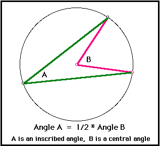 While a central angle with a certain degree measure intercepts an arc of the same degree measure, an inscribed anlge intercepts an arc with twice the degree measure of the angle.